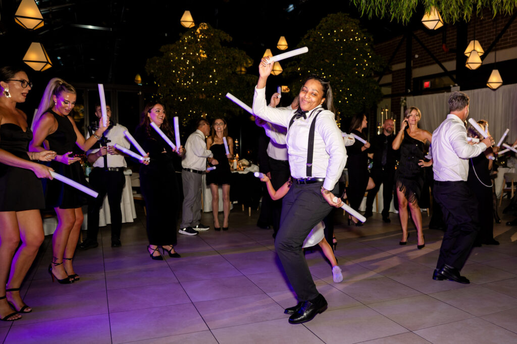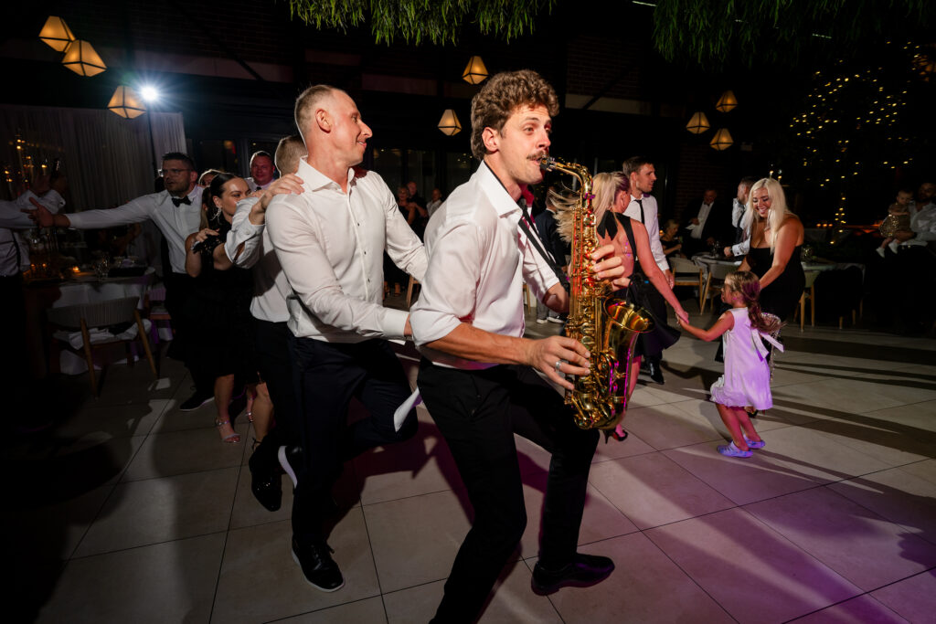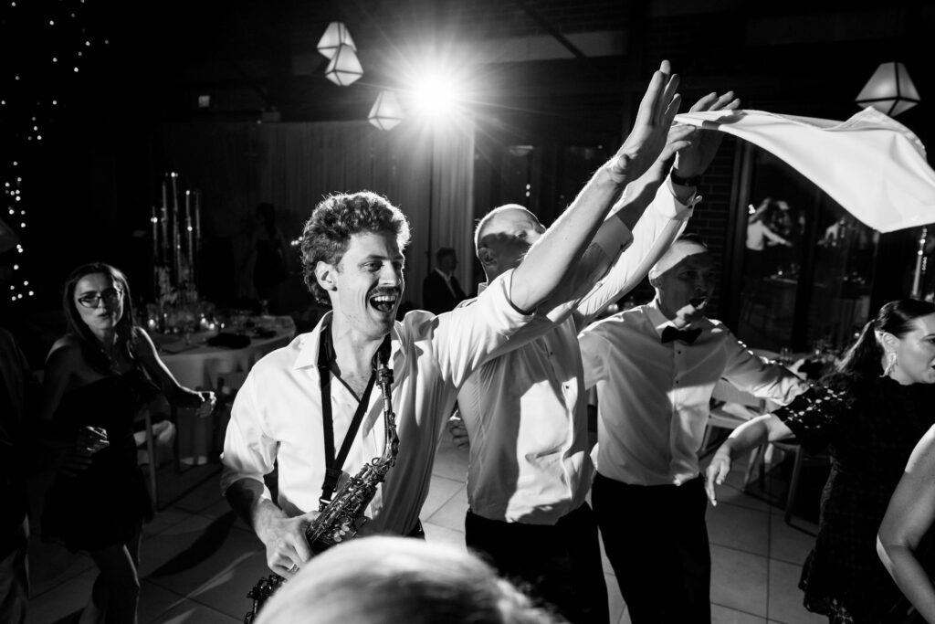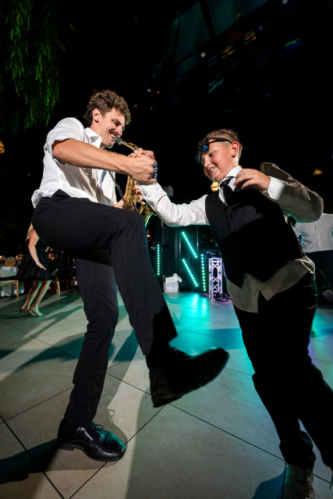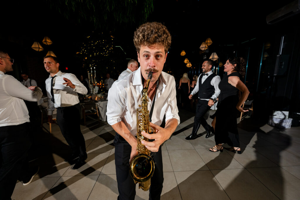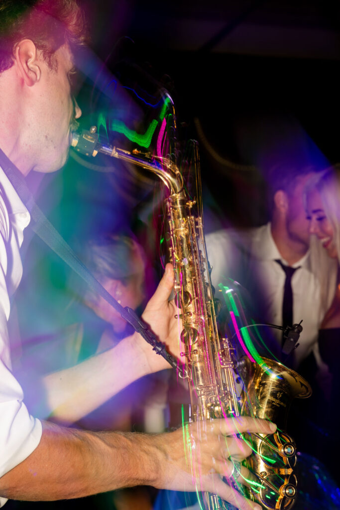 I’ve photographed weddings with sax players before. Many stay near the DJ booth, play a few songs, and blend into the background. Harry did the opposite. He was on the dance floor, weaving through guests, feeding off the energy, pulling everyone in. The dance floor was packed all night — no breaks, no dips.